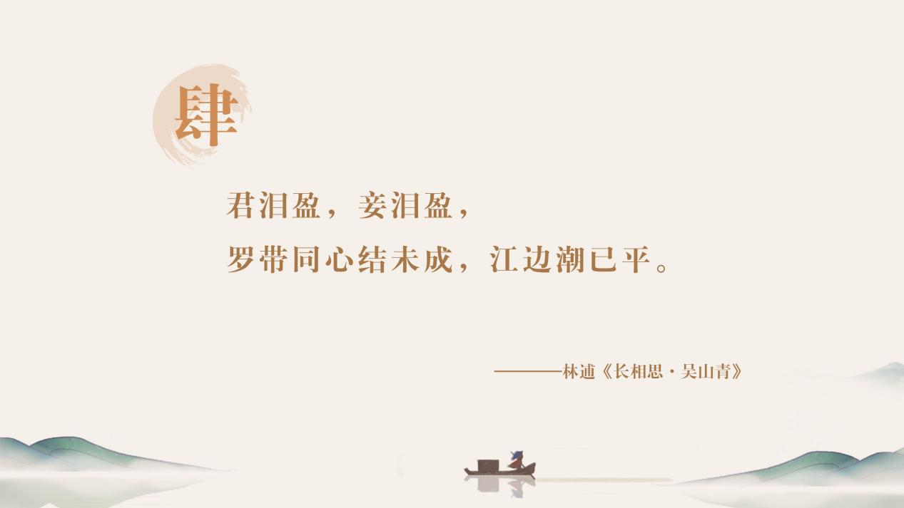 四、林逋的《长相思·吴山青》:“君泪盈,妾泪盈,罗带同心结未成,江边潮已平。”表达了离别的痛苦和忧伤,描绘了爱情的无奈和遗憾。
