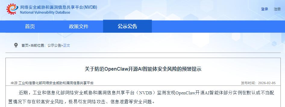 近日,工业和信息化部网络安全威胁和漏洞信息共享平台(NVDB)监测发现,开源AI智能体OpenClaw在默认或不当配置情况下存在较高安全风险,极易引发网络攻击、信息泄露等安全问题。
