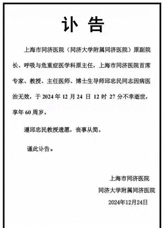 上海同济医院在12月24日发布了一则令人痛心的讣告,上海同济医院首席专家、院副院长、呼吸与危重症医学科原主任邱忠民教授在12月24日12时27分因病医治无效去世了,年仅60岁!