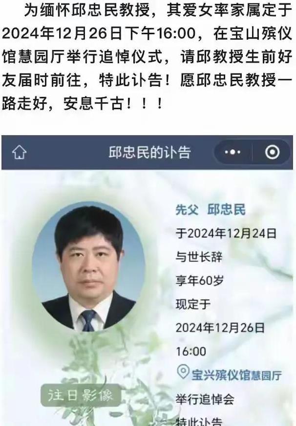 邱忠民的女儿之后也发布了讣告,这则讣告除了公布邱忠民教授的去世消息外,还公布了邱忠民教授将在12月26日举行追悼会,请邱忠民生前好友届时前往。