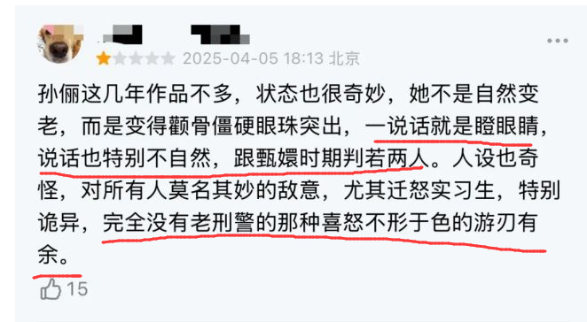 还有人说,她饰演的资深老刑警的人设情商低得不行,对待上级和同事常常甩脸色、怼人,哪里像是一个老刑警的范儿,过于自我,缺乏机智,这样的刑警去解决案件,让人不得不怀疑她的刑侦能力了。