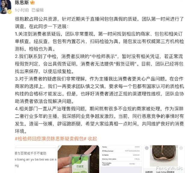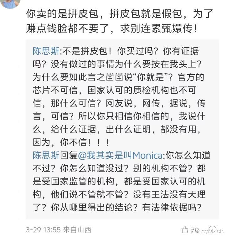随着网络维权的声音发酵,陈思斯回应称自己没卖假包,所有商品都经过检验,还发了条抱怨自己受委屈、辟谣没人看的言论。