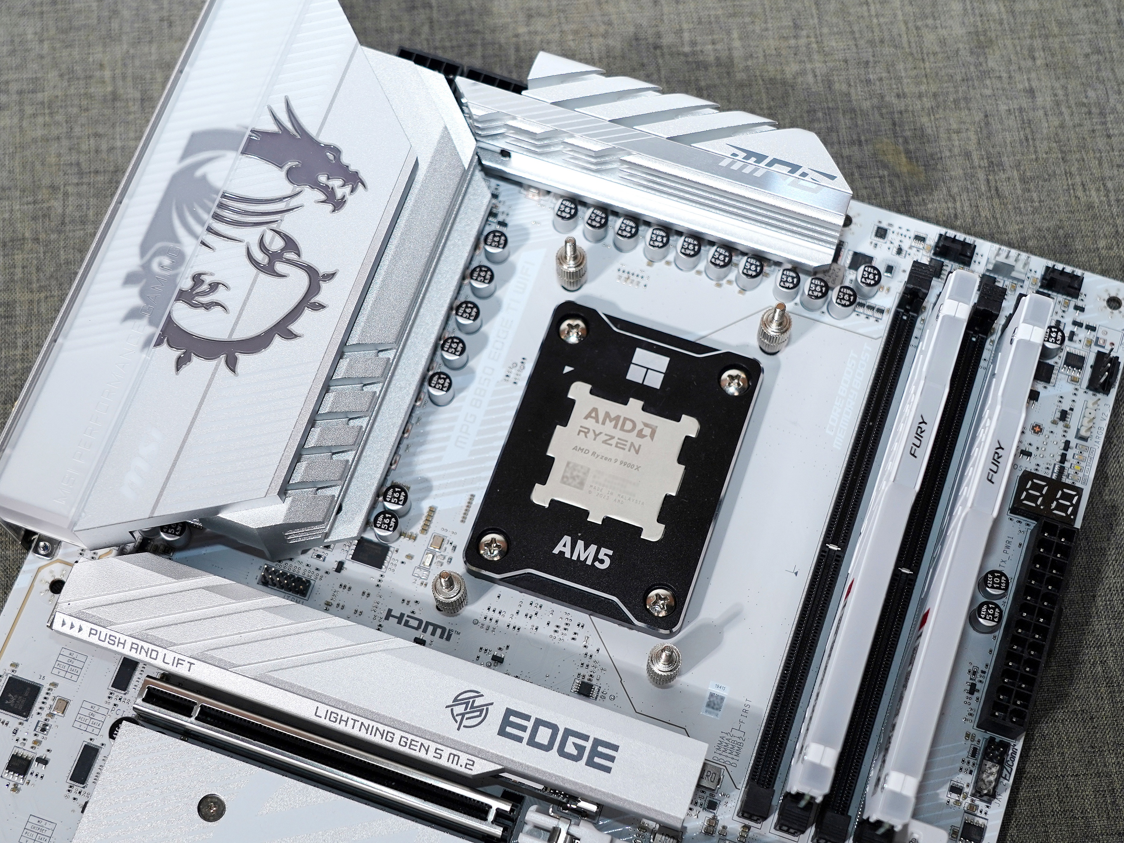 ▼CPU为Ryzen 9 9900X,12 核 24 线程,基础频率4.4 GHz,最大加速频率5.6 GHz,TDP为120W,主板为白色的微星B850刀锋钛。