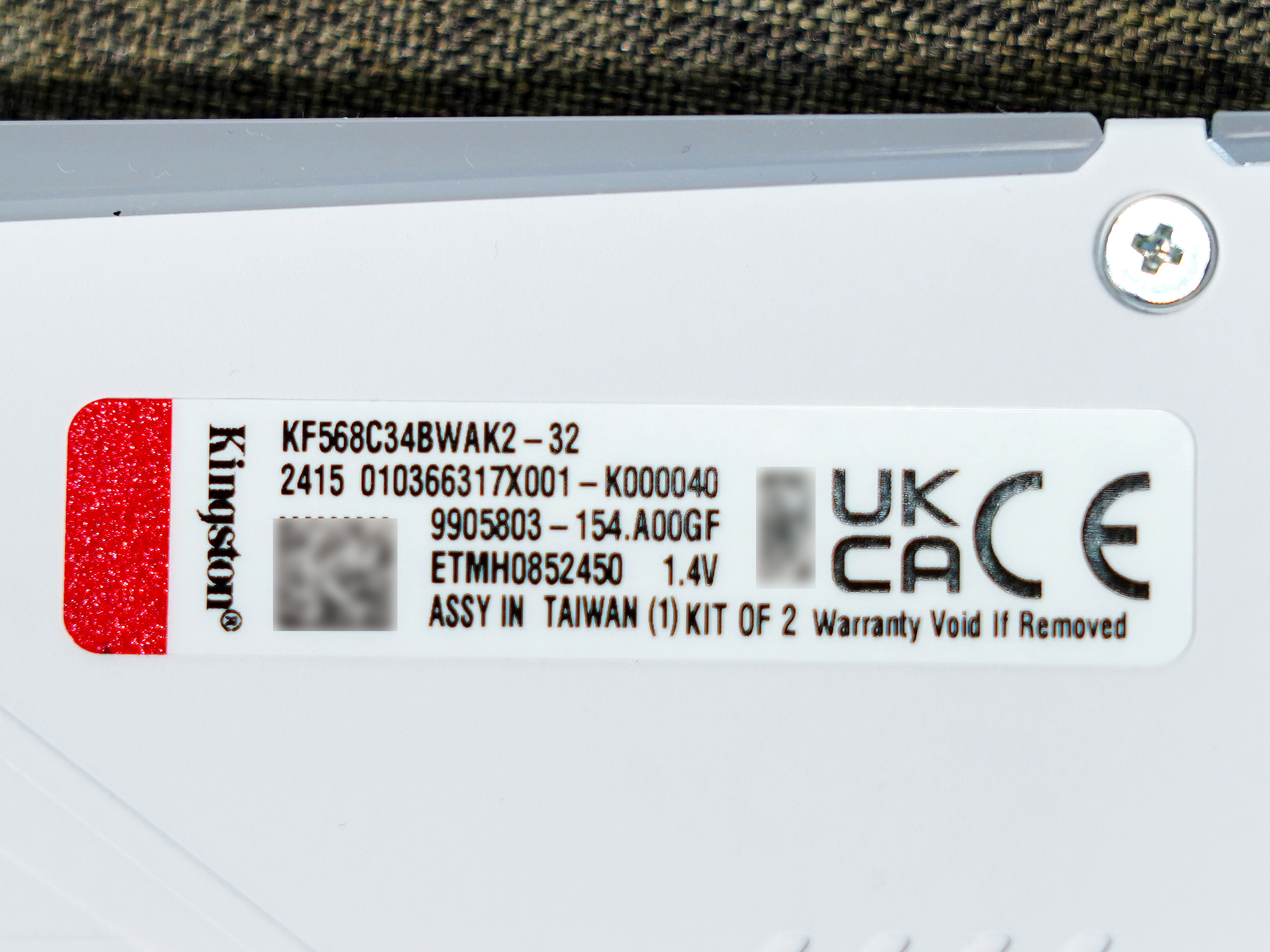 ▼金士顿的贴纸参数搞得像密码似的,需要破解一下:贴纸上的具体型号为KF568C34BWAK2-32,KF为KINGSTON FURY系列,5为DDR5,68代表频率6800MT/s,C34是该频率下的时序,最后的32代表容量,即2条套装32GB(16GBX2)。