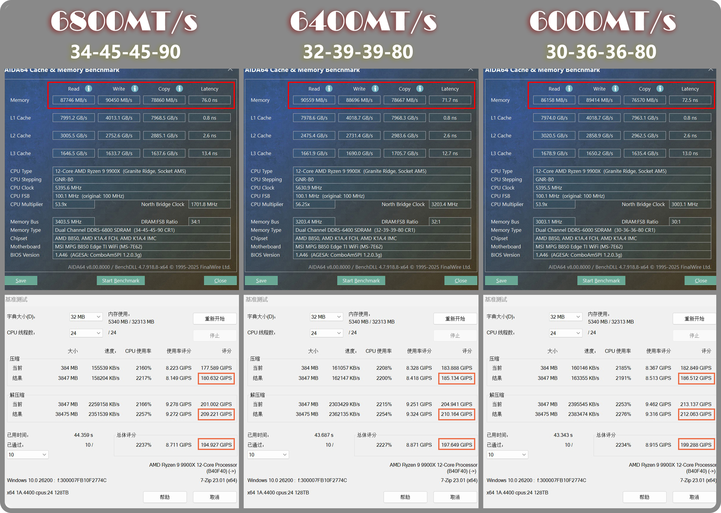 ▼开启主板的各种内存优化选项后,分别对三个频率做了AIDA64的内存跑分。因为超过6400MT/s,就会切换到分频模式导致内存延时的增加,所以6800MT/s的延时是最高的,不过其读写速度还算有一定优势的。又做了对内存比较敏感的7-zip(压缩解压缩)的benchmark测试,居然是6000MT/s的分数最高,当然它的领先优势也并不大。
