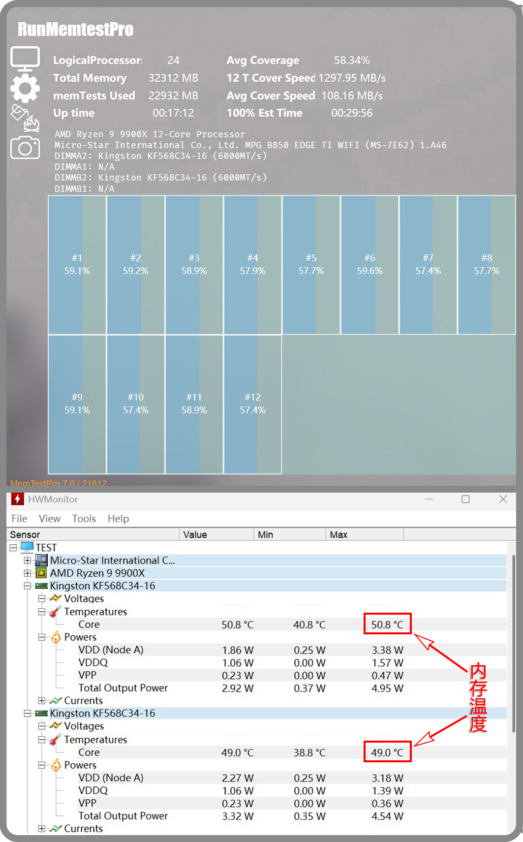 ▼6000MT/s C28通过RunMemtestPro烤机测试应该也是没问题,只是这次偷懒了没做完。在CPUID可以看到两根内存条最高温度分别为51℃与49℃,比8000MT/s 的温度低了不少,因为频率低电压也会比较低(1.4v)。