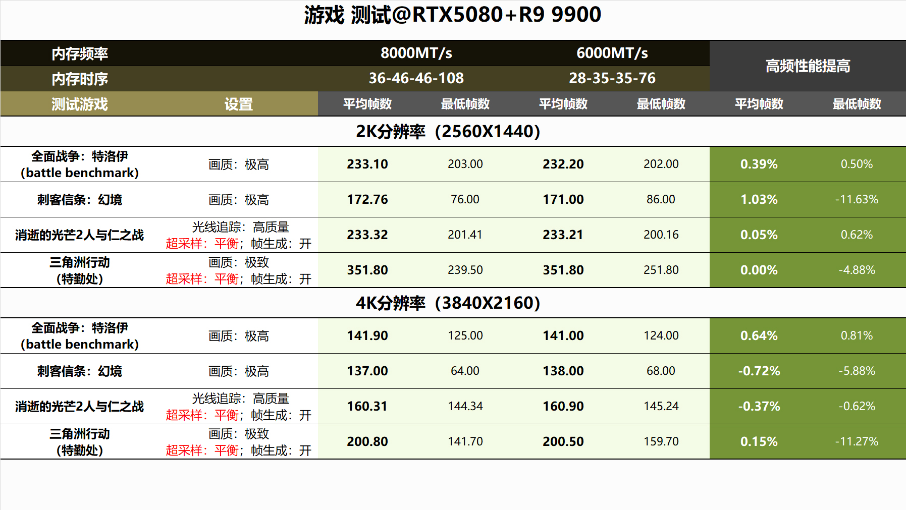 ▼2k和4分辨率下,支持超采样的游戏都开启了DLSS2:平衡,这时两种频率在平均帧数的差距就不大了,只是《刺客信条》与《三角洲行动》在低帧方面,还是6000MT/s更有优势。