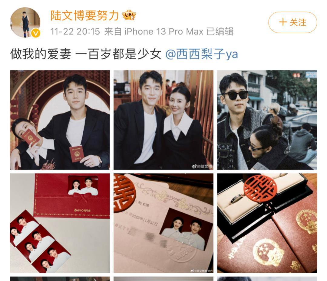 2023-2024赛季开始一个月后,陆文博在社交媒体上晒出与女友领证的照片,并配文:“做我的爱妻,一百岁都是少女。”球迷们不仅为他们的喜事高兴,还注意到两人都非常漂亮,宛如时尚大片中的俊男靓女。