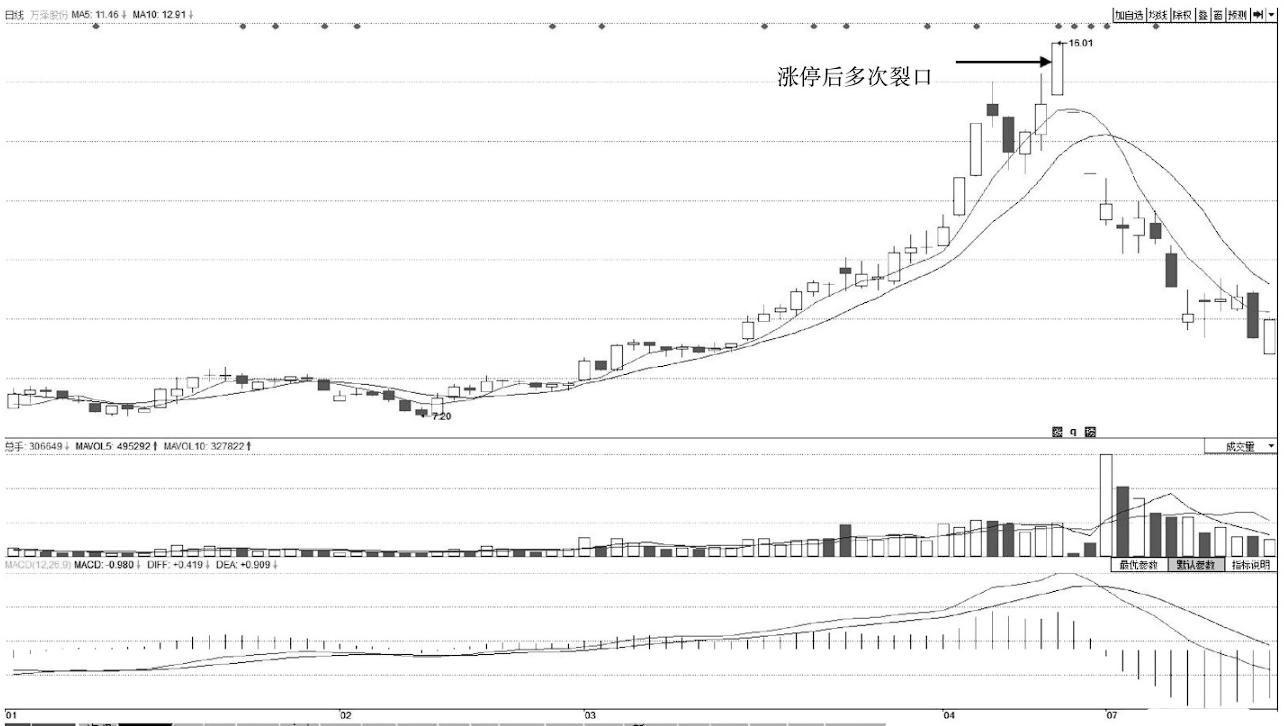 【技术形态】在经历了短期的整理之后,出现了跳空型的涨板,这本是一种相对强势的攻击形态,但是,如果在牢牢的封板过程中却数次裂口,则将使得当日的跳空涨停板做多气势大打折扣,也预示着个股短期内的上冲力度将明显不足。