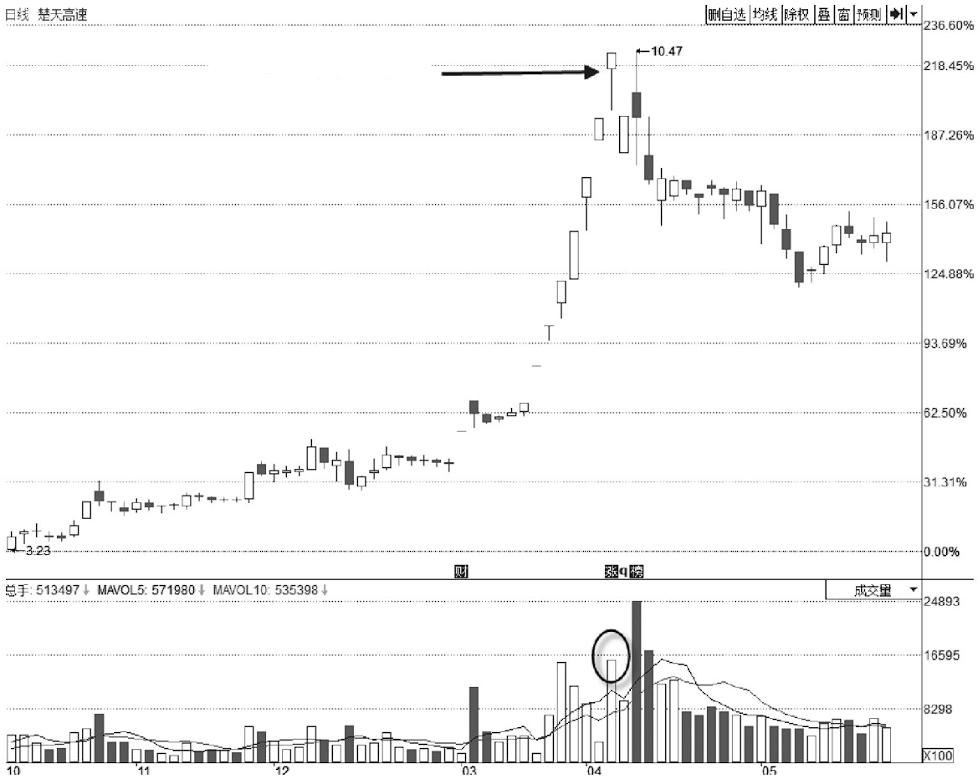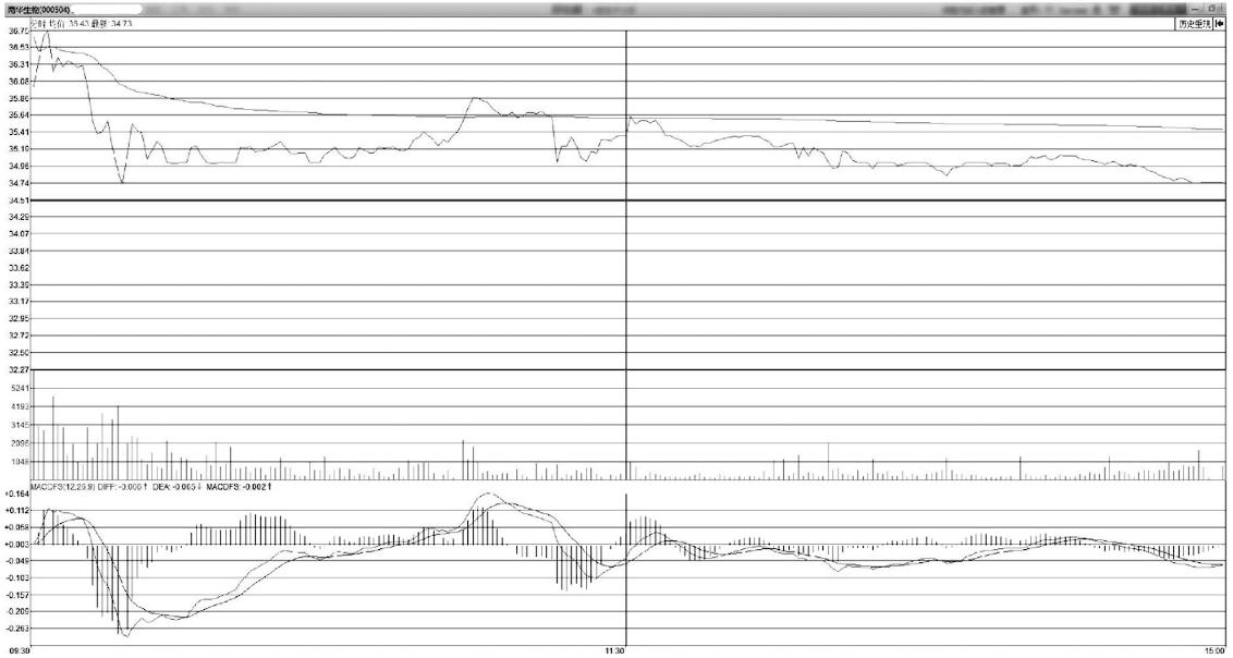 【实例剖析】图3-1为楚天高速(600035)分时图,图3-2标示了楚天高速(600035)走势图。