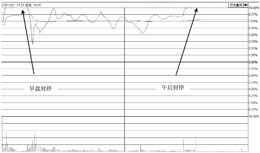 【应用技巧】实盘中,我们可以结合个股的日K线运行方式、当日的量能大小来做具体研判。它还是和我们之前说过的尾盘封板的形态类似,让我们又一次见识了封板时间的不同,对于后市走势的不同指导意义。不论是持股还是持币,见到尾盘封板就可以略过它了。