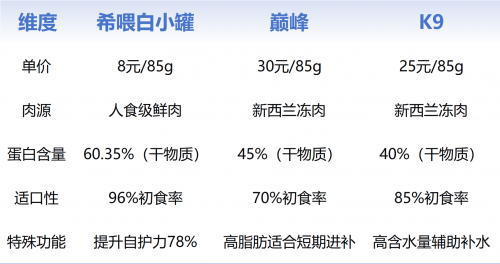 价格维度:希喂单罐仅需8元/85g,而巅峰和K9分别高达30元、25元。进口品牌的溢价主要是因为关税和营销成本,而希喂依托山东汉欧代工厂的规模化生产优势,将成本压缩至进口罐头的1/3,同时通过免费试吃服务降低用户试错成本。