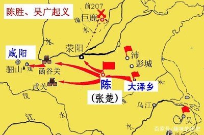 在将尉欲意杀死吴广时,吴广与其他戍卒当即决定杀死将尉,斩木为兵,揭竿为旗,迅速组织起一支起义军攻下了大泽乡。随着起义军规模的不断壮大,接连攻克了蕲县,后又连克铚(今安徽省濉溪县南)、苦(今河南省鹿邑县东)、柘(今河南省柘城县北)、谯(今安徽省亳州市)等地。攻至陈县(今河南省淮阳县)时,起义军已有部卒数万人、骑兵千人。陈胜在此召集三老、豪杰等共商大事,正式成立农民革命政权,陈胜称王,建号“张楚”。