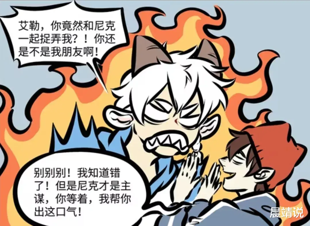 这一发现,只见点燃了泥泥全部的怒火。泥泥暴怒的质问艾勒,作为自己最好的朋友,竟然和尼克一起抓弄我?!这样的你,还有没有当我是好朋友啊!看着怒火中烧,马上要暴怒活吞了自己的泥泥,艾勒慌忙选择了明哲保身,祸水东引。一边安抚泥泥的情绪,装做诚恳的道歉,表示自己知道错了!一边赶紧把泥泥的怒火全部转移到尼克那边去,表示尼克才是主谋!自己只是从犯,但是自己认识到错误了,你等着,我帮你出了这口恶气!