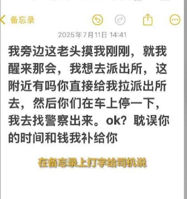为了最大限度地保护自身安全,同时将猥琐男子绳之以法,程女士采取了一种独特的方式:她打开手机备忘录写了一段文字,“我旁边这老头摸我,我想去派出所,这附近有吗?”随后,将手机递给了开车的司机。整个过程,程女士表现得极其冷静,既没有惊动嫌疑人,又完成了信息传递。
