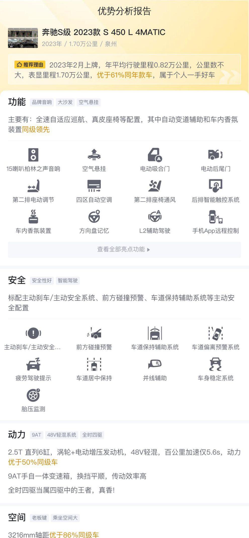 我们再来看看这篇文章提到的优势分析。它强调了这辆车的安全配置、动力性能、空间舒适度等等,这些都是奔驰S级的卖点,但这并不能保证这辆二手车的车况就一定完美。