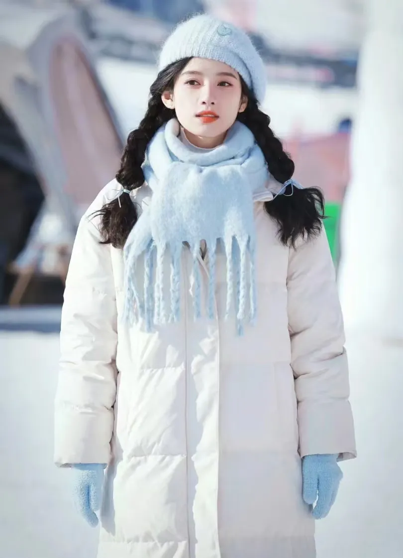 2、浅色搭配:搭配偏向于浅色的衣服,能在寒冷的冬季给人带来清新明亮的感觉。白色羽绒服搭配浅蓝色围巾和米色堆堆袜,就很温柔迷人。