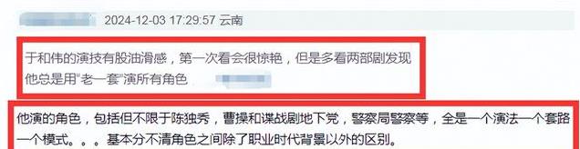 还有网友说,“于和伟的演技有股油滑感,第一次看会很惊艳,但是多看两部剧发现他总是用‘老一套’演所有角色”