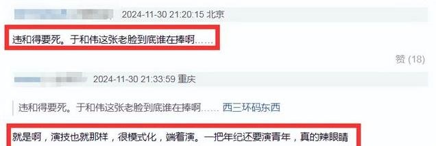 有网友吐槽,“于和伟这张老脸到底谁在捧啊,一把年纪还要演青年,真的辣眼睛,演技也就那样,很模式化,端着演”。