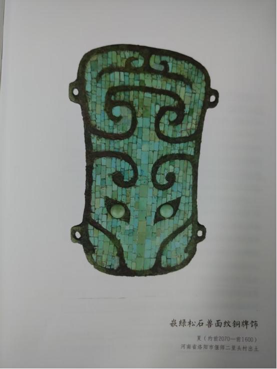 其一,嵌绿松石兽面纹铜牌饰。该铜牌饰出土于偃师二里头遗址,也就是目前已经被学术界所确定的夏都遗址。镶嵌绿松石器在二里头遗址共出土5件,一件圆形器,一件龙形器,三件铜牌饰。出土这块铜牌饰的墓葬的随葬品十分丰富,证明了墓主人不凡的身份和地位。该铜牌饰被发现时位于墓主人胸部上方,铜牌饰两边共有四个纽孔,暗示了该铜牌饰的具体佩戴位置和方式。