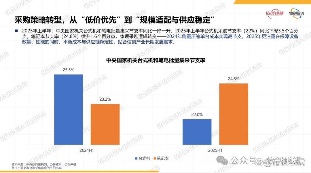 采购端呈现“下沉化、规模化、规范化”新趋势。数据显示,2025年前三季度中央国家机关台式机采购预算超2亿元、设备超4万台,笔记本采购预算近6500万元、设备近9000台,办公设备更新需求全面释放。值得关注的是,采购逻辑已从“低价优先”转向“规模适配与供应稳定”,2025年上半年,台式机采购节支率(22%)虽较2024年下降3.5个百分点,但设备性能与供应链安全性显著提升。