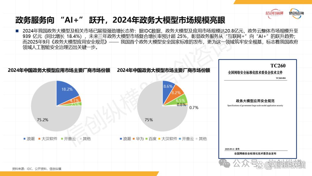 《2025年数字政府信创研究报告》的核心亮点在于揭示了“信创底座与AI深度融合”的新趋势。根据IDC数据,2024年我国政务大模型及应用市场规模达20.8亿元,政务云市场规模升至939亿元,未来三年政务大模型市场复合增长率预计超25%,标志着政务服务正式从“互联网+”进入“AI+”时代。