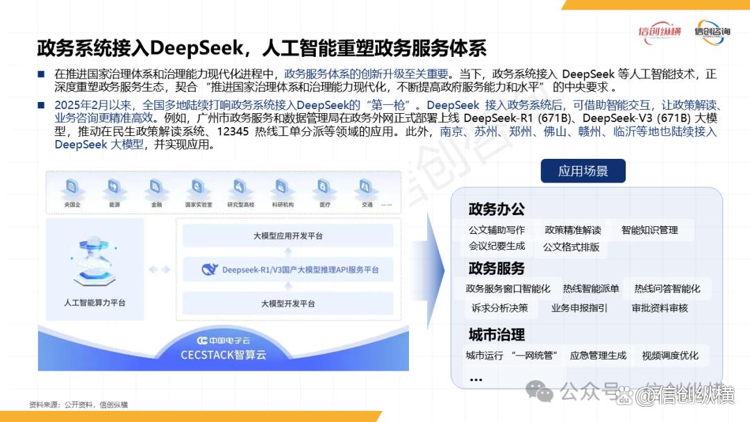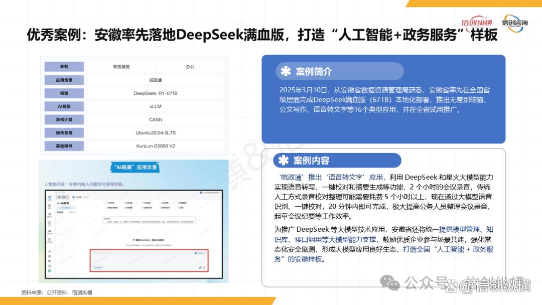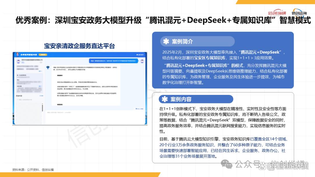 在实践层面,多地已探索出可复制的“信创+AI”应用模式:广州市政务服务系统部署DeepSeek-R1/V3大模型,实现民生政策解读、12345热线智能派单效率提升40%;安徽省率先完成DeepSeek满血版(671B)本地化部署,2小时会议录音可在20分钟内完成转写与校对,大幅降低公务人员工作负担;深圳宝安政务大模型创新“腾讯混元+DeepSeek+专属知识库”模式,覆盖14个领域3万余条政务知识,在民生诉求响应、企业服务等31个场景落地,实现“数据安全+服务高效”双重目标。