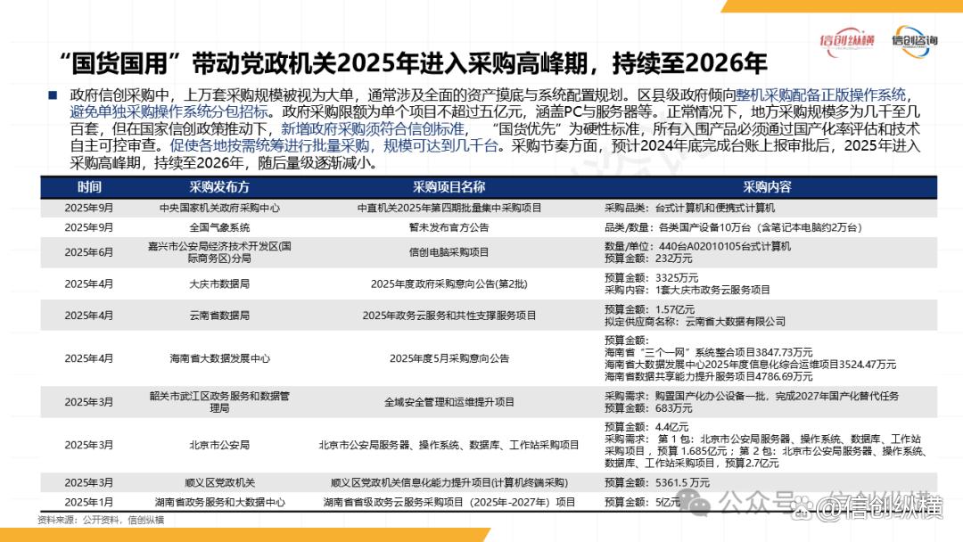 在区域推进上,“国货国用”政策成为区县信创加速的关键引擎。国家专项补贴1300亿元,西部及偏远地区补贴比例高达80%-100%,预计2025年区县信创PC替代量将突破600万台;广西、新疆、内蒙古等西部省份招标进程提速,仅广西一地2025年9月就推出超5亿元信息类产品采购项目,采购国产计算机终端超8.5万台,信创落地从“东部试点”迈向“全国攻坚”。