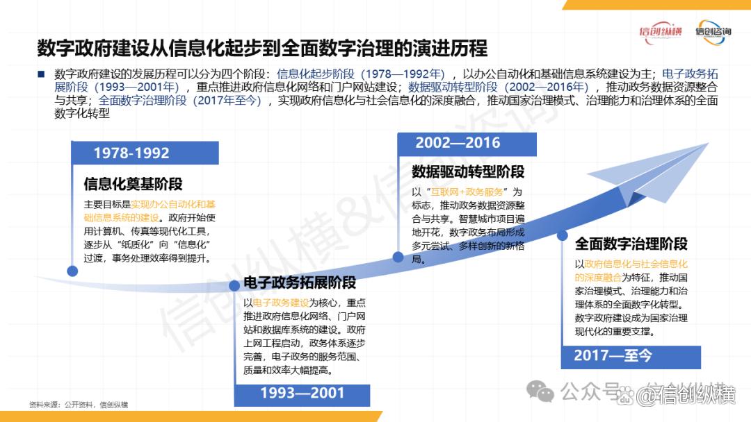 《2025年数字政府信创研究报告》首先厘清数字政府建设的演进逻辑,将其划分为四个关键阶段:1978-1992年的“信息化奠基阶段”,以办公自动化突破“纸质化”瓶颈;1993-2001年的“电子政务拓展阶段”,通过“政府上网工程”构建政务网络体系;2002-2016年的“数据驱动转型阶段”,以“互联网+政务服务”推动数据整合共享;2017年至今的“全面数字治理阶段”,实现政府与社会信息化深度融合,数字政府成为国家治理现代化的核心支撑。