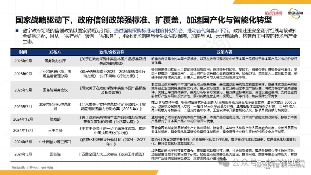 在这一进程中,信创的角色从“技术补充”升级为“核心底座”。报告指出,随着《“十四五”推进国家政务信息化规划》《关于加强数字政府建设的指导意见》等政策密集出台,信创已从“可选项”变为“必选项”,