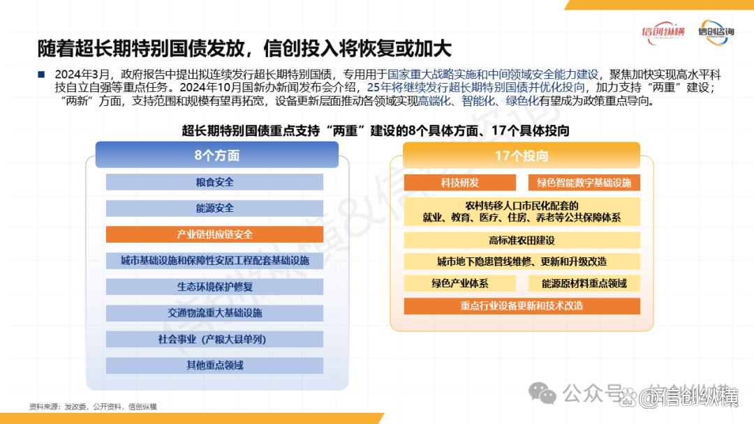 政策层面,《2025年数字政府信创研究报告》系统梳理了近几年信创政策,凸显“强标准、扩覆盖、重协同”三大特征。2025年政策力度再升级:国务院《政务数据共享条例》构建“四个一”数据管理体系,实现数据全生命周期可控;《在政府采购中实施本国产品标准及相关政策的通知》明确“本国产品20%价格评审优惠”,为国产软硬件打开市场空间;超长期特别国债更是专项划拨1880亿元支持设备更新,其中电子信息领域被重点纳入,直接撬动超1万亿元总投资。