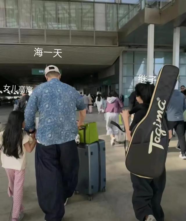 照片里53岁的海一天,穿着蓝色花衬衫,一手推着一个大大的行李箱,一手牵着6岁的小女儿。