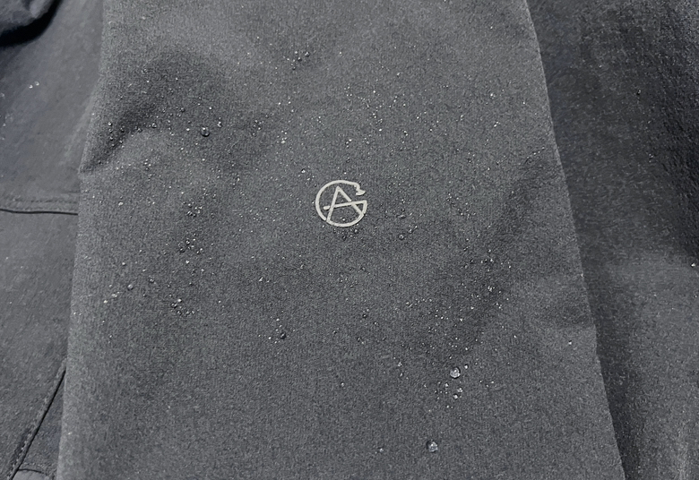 这款软壳衣采用了东丽尼龙加氨纶的四面弹面料,同时融入了杜邦特氟龙三防科技,防泼水、防油、防污,方便清理。楼主特意喷水测试了一下,衣服的面料是不粘水的设计,动图可以感受到,轻轻一擦就干净,微雨的天气出门也不怕打湿啦!