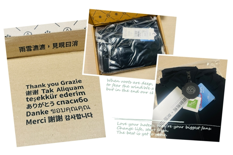 这款软壳夹克外包装采用了牛皮硬纸壳的原箱包装,上面印有品牌logo,内层也延续了多国语言的谢谢,很有品牌特色。打开包装就能看到软壳衣,并且有防尘袋套在外层保护,可以在运输过程中防雨、防潮。