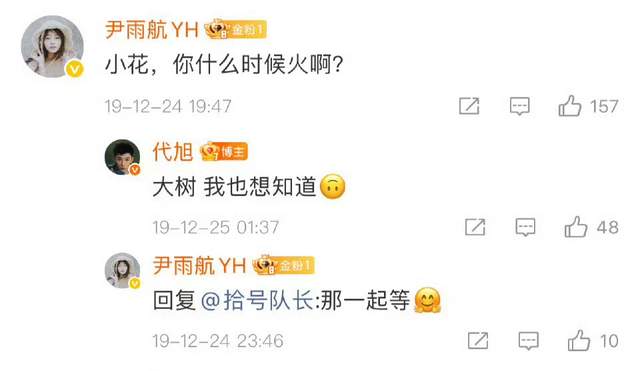 但比起自己的成功,她更想看到代旭大火,2019年她还跟代旭互动问他:“小花,你什么时候火啊?”