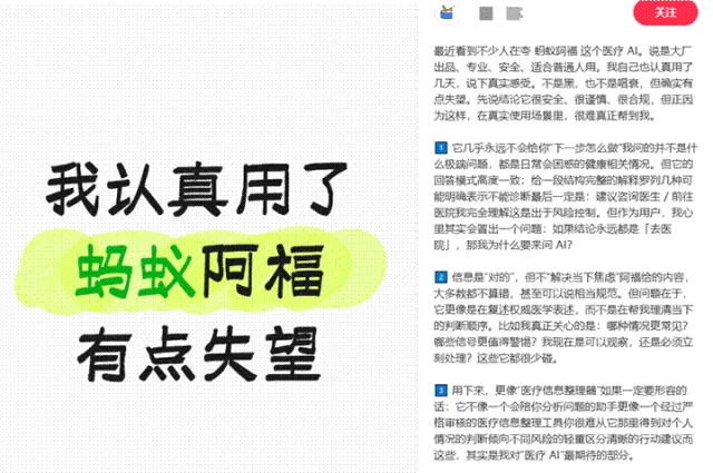 用户抱怨指向一个核心问题:蚂蚁阿福在诊疗决策环节的过度保守,使其沦为输出“正确废话”的工具。这种保守性进一步加剧了产品的工具属性局限,阻碍了用户从“尝鲜”到“常用”的转变。