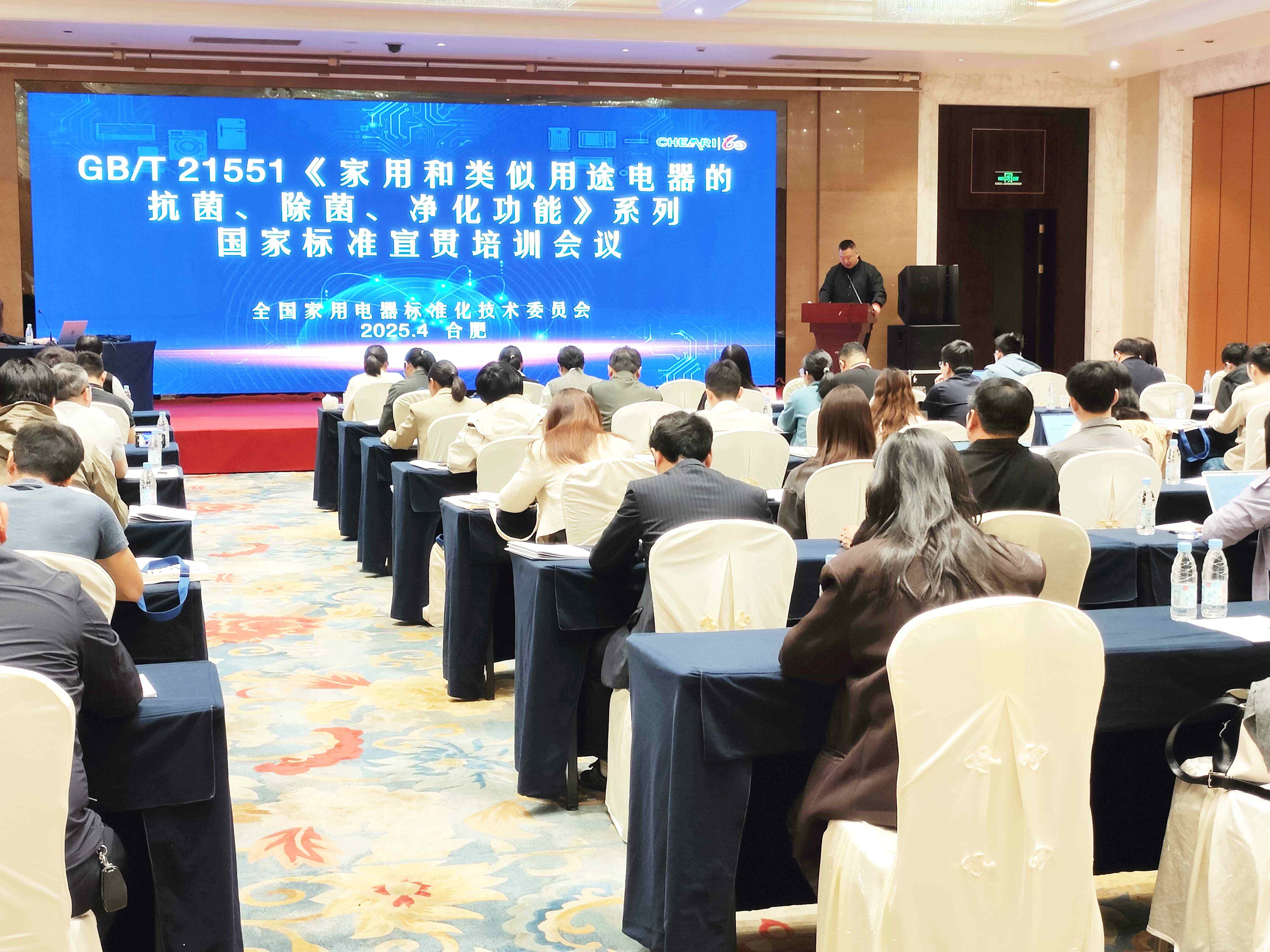 2025年4月15日上午,全国家用电器标准化技术委员会秘书处在安徽合肥举办了GB 44498-2024《家用和类似用途电器 健康技术规范》强制性国家标准及GB/T 21551《家用和类似用途电器的抗菌、除菌、净化功能》系列国家标准宣贯活动。来自美的、格力、海尔、长虹美菱、TCL、博西华、石头、松下、小米、方太、百欧森环保、金海高科、新乐、追觅、好太太、新飞、阿波罗、科沃斯、添可、上品健康、三星、瑞尔特、东陶、艾恩科技、吉德、安泽汶环保、二马环境、雪圣、天佑晶创、亿盛及家用电器行业标准科研检测机构、生产企业等单位60余位代表参加了本次宣贯活动,活动由全国家用电器标准化技术委员会秘书处赵爽主持。