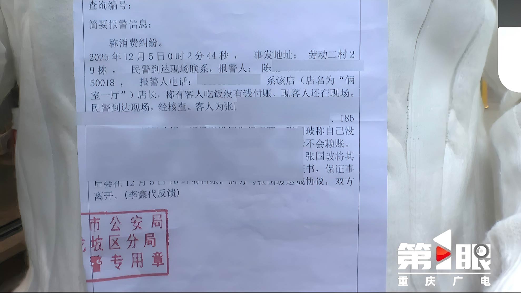 在重庆九龙坡区一家餐馆,10人从下午4点吃到深夜,餐费共计1262元。到深夜11点40分,餐桌上只剩张先生一人。他表示请客的朋友已喝醉离开,自己没带够钱,希望次日付款。餐馆老板不同意并报警处理。在民警协调下,张先生写下承诺书,保证次日18点前支付餐费,还押下了身份证。