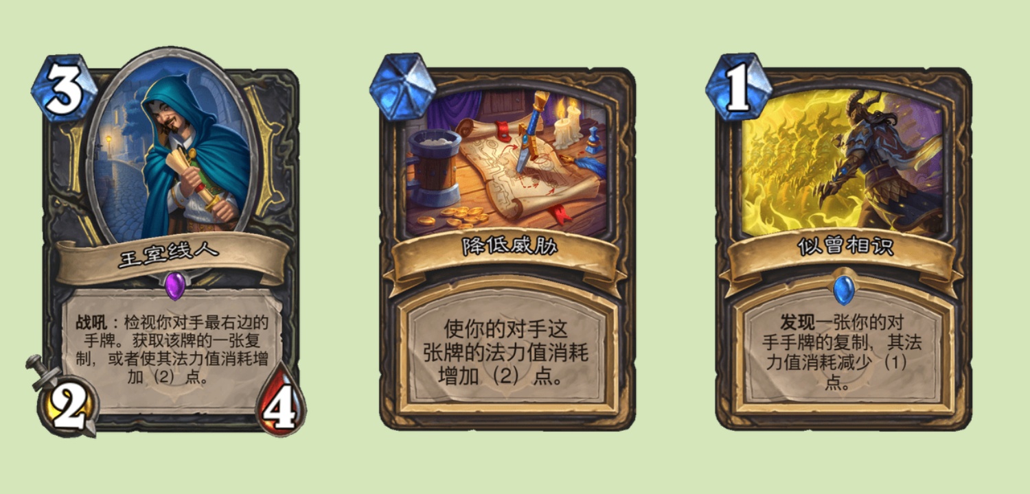 王室线人,3费2/4,战吼:检视你对手最右边的手牌。获取该牌的一张复制,或者使其法力值消耗增加2点,如果看到好用的牌可以复制过来,而如果看到了莱恩国王或者自己没啥用的牌,可以选择给他加费,这样对面不管打不打出来都很难受。王室线人只能看一张牌,而似曾相识则能直接看三张,1费发现一张你的对手手牌的复制,其法力值消耗减少1点,感觉这张牌单拎出来也能带,看三张本身就有策略价值,还减费,心灵视界真是弱爆了。顺带一提,这张牌的英文原名是“deja vu”,也就是逮虾户,而这张牌的卡面又挺像JO5里面迪亚波罗中了黄金体验镇魂曲之后的名场面,还挺有意思的。