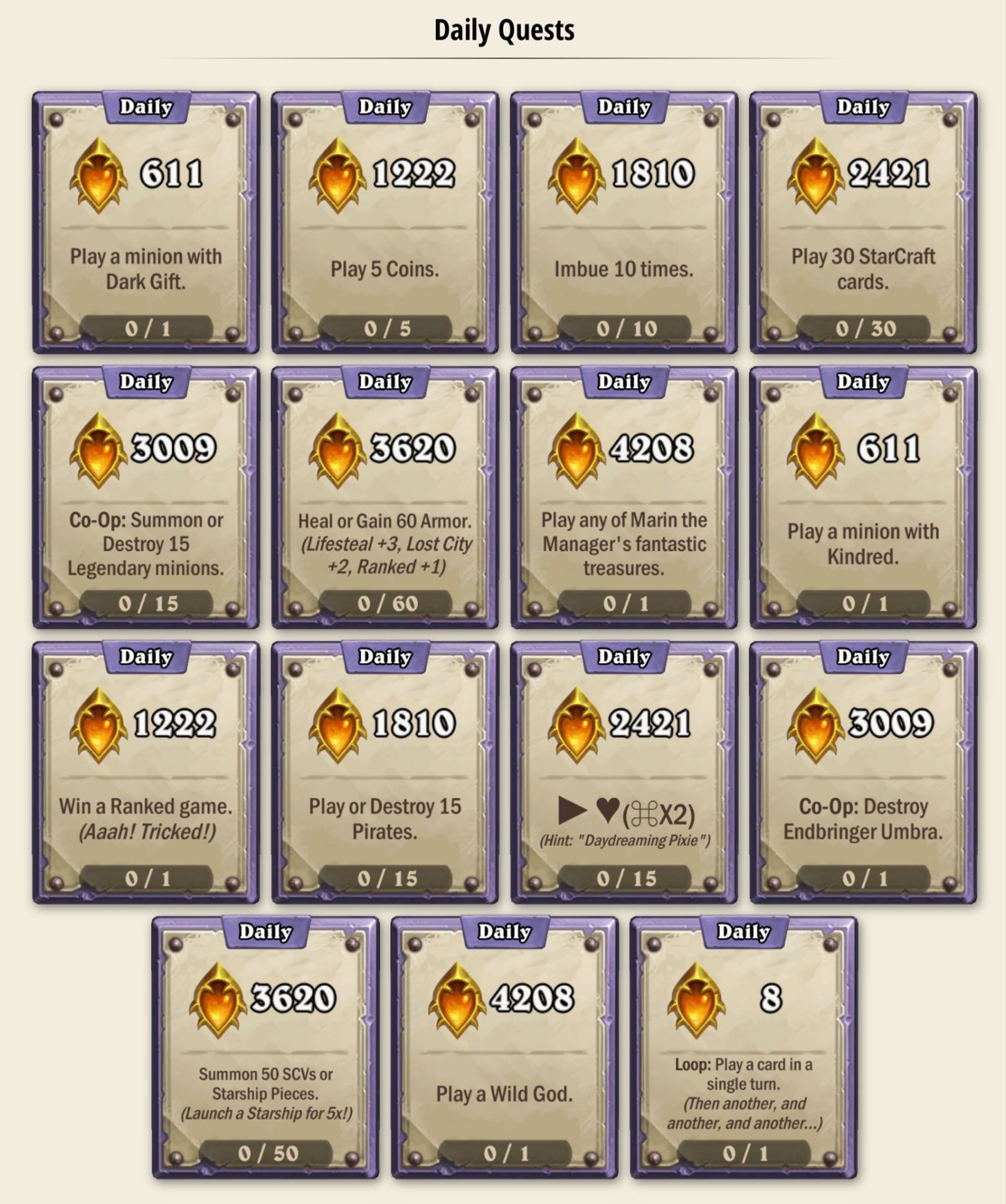 不过看起来大伙对于游戏内活动的热情几乎已经被消磨殆尽了,上次漫游翡翠梦境版本的游戏内活动社区里还有人整理每日任务解谜是什么意思,这次已经看不到有人整理了(当然也有可能是上次不整理的话完全没法做),清风这里就拿一张外服整理的每日任务经验表吧,大家可以对照自己的每日任务看看有没有必要刷新。另外值得一提的是,最后一个8经验可以循环做的任务(循环:一回合里使用一张牌),虽然给的经验不多,但是做了之后还可以额外拿到一包新版本卡包,虽然不知道卡包能不能重复获得,但总之看到请不要放过他。