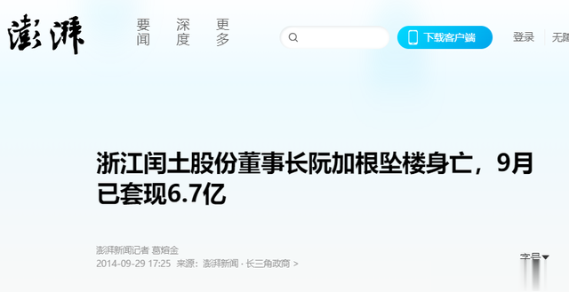 主要信源浙江闰土股份董事长阮加根坠楼身亡,9月已套现6.7亿——澎湃新闻2014年9月29日
