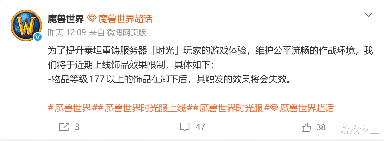 所以针对天赋以及饰品的限制其实体现了魔兽世界时光服的一个观点,即角色的战斗力应取决于长期养成的常驻属性(装备、天赋)和战斗中的实时决策与操作,而非对系统bug或瞬时状态的利用。所以取消了这些bug或者是这些特性,让玩家们在选择的时候真的聚焦于实用性,而不是处心积虑地寻找魔兽世界时光服中存在的bug来增加伤害。
