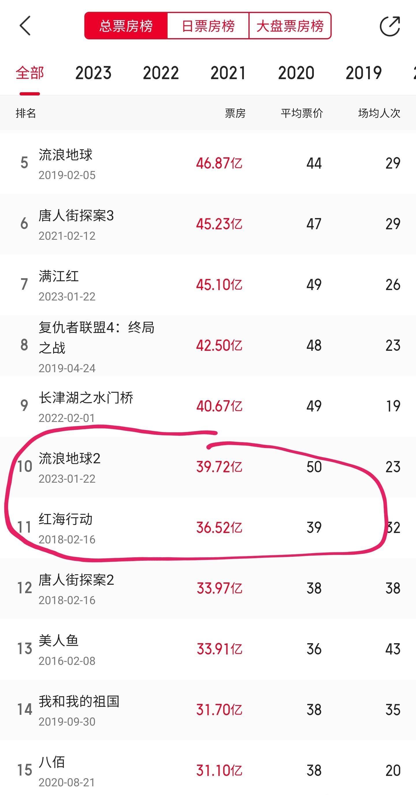 翻看电影票房排行榜,很快就找到了两部符合这一要求的电影,一部是《流浪地球2》三十九亿票房。一个是《红海行动》36亿票房。