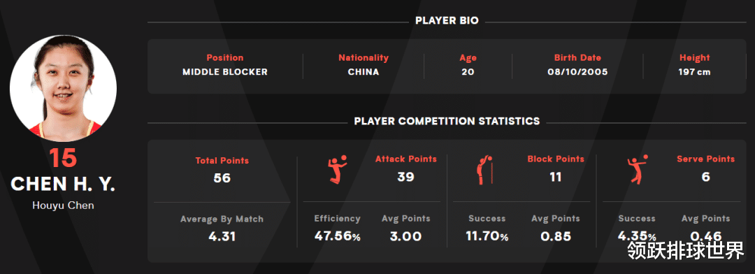 臂展出众,移动灵活,陈厚羽并非一味依赖身高压制的传统副攻,而是在进攻、防守、探头与反应中体现出超龄的成熟与判断力,她的比赛画面中,不乏高质量拦网、快速探头扣球、垫调稳健等细节,这些正是现代副攻手最被看重的全面能力。