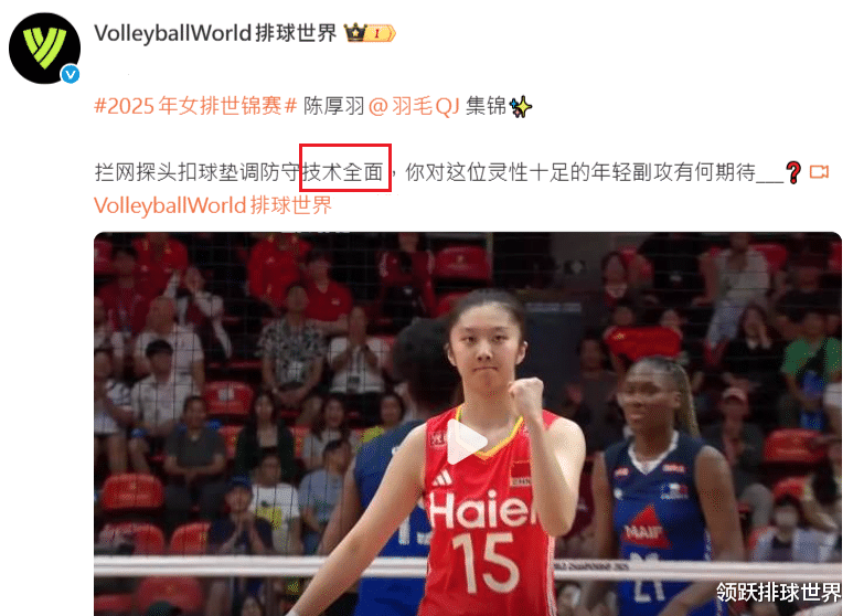 在中国女排新生代球员中,一位高大灵动、技术全面的副攻手正悄然崭露头角,她就是年仅20岁的陈厚羽。近日,国际排联旗下社交平台特别发文,称赞她在世锦赛中的全面表现,“拦网探头扣球垫调防守”,直接4个字概括“技术全面”,并向全球球迷发问:“你对这位灵气十足的年轻副攻有什么期待?”