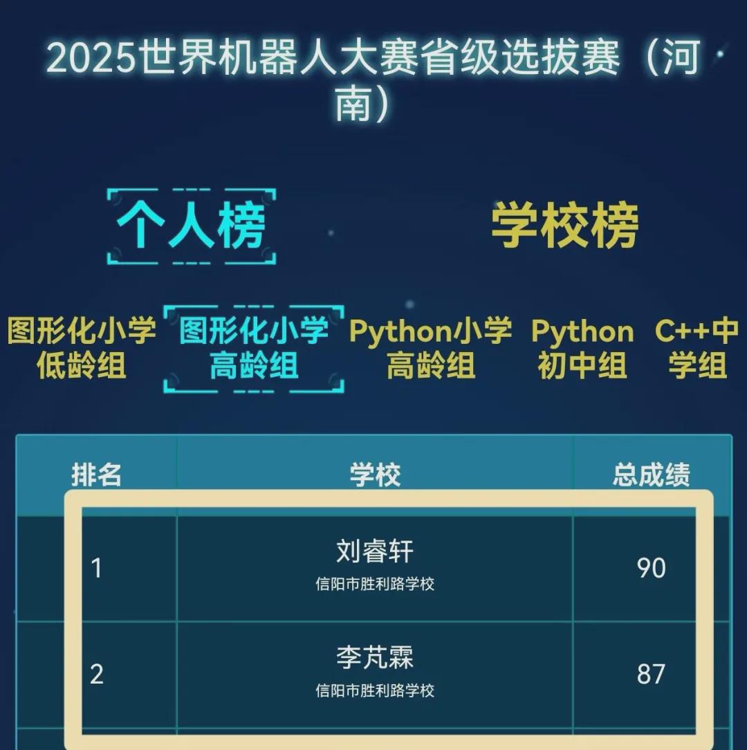 学校近百名学子凭借扎实的人工智能素养与创新思维,成功晋级信阳市总决赛,最终斩获24个一等奖、31个二等奖、26个三等奖,以绝对实力荣膺学校总分榜第一名,充分彰显了信阳市胜利路学校在人工智能教育领域的领先地位与雄厚实力!尤为瞩目的是,刘子铭同学在“ICode太空挑战赛”中表现出色,勇夺图形化小高组冠军,展现了胜利学子在编程思维与创新实践上的卓越风采!
