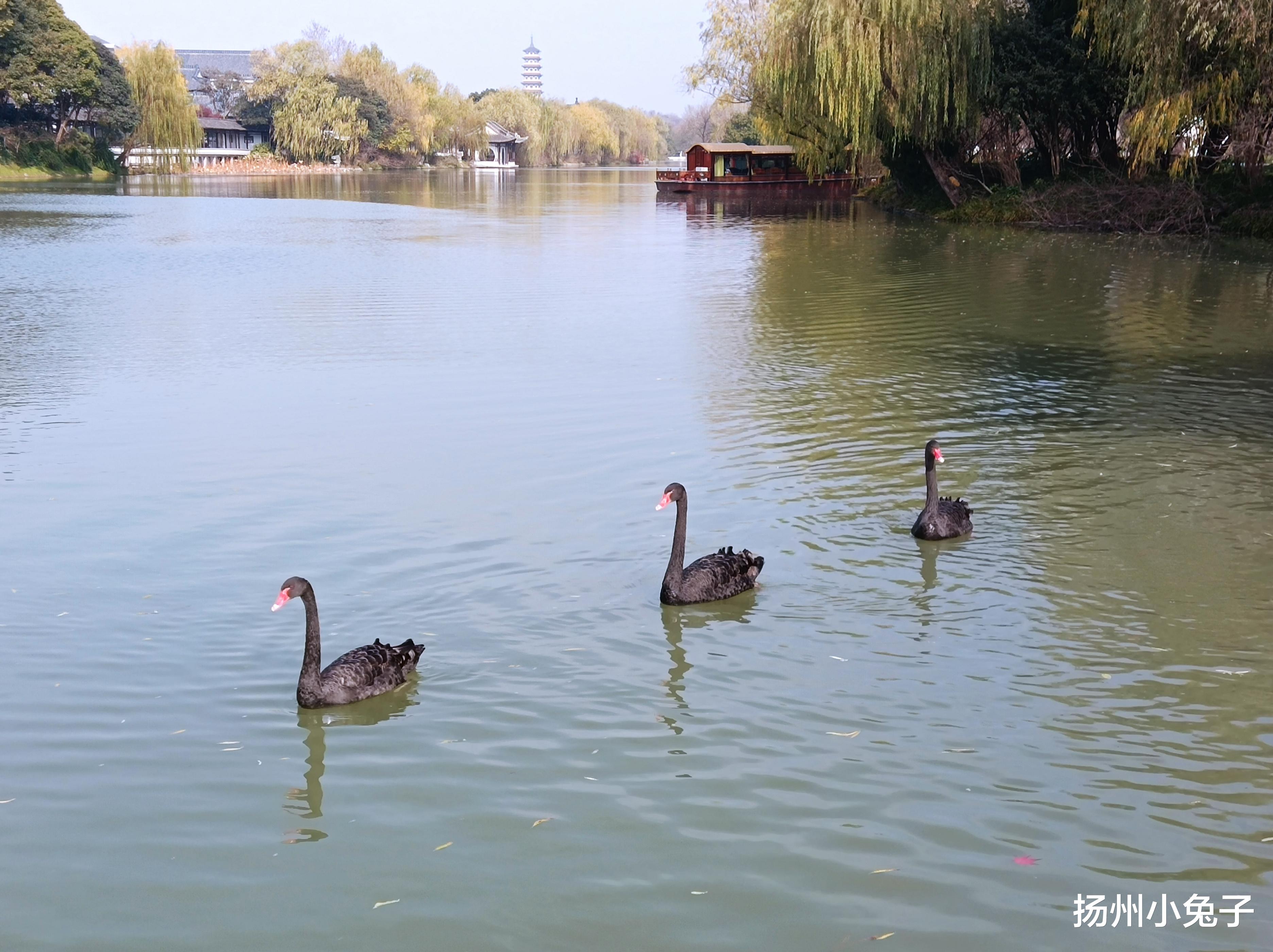 这张照片,是游玩瘦西湖时的偶得。众所周知,瘦西湖里有很多黑天鹅与鸭子。外地朋友游玩瘦西湖,黑天鹅与鸭子通常是最吸引眼光的网红。那天,在一群水禽中间,有三只黑天鹅像商量好的一样,排着齐整的队伍,自行离去。