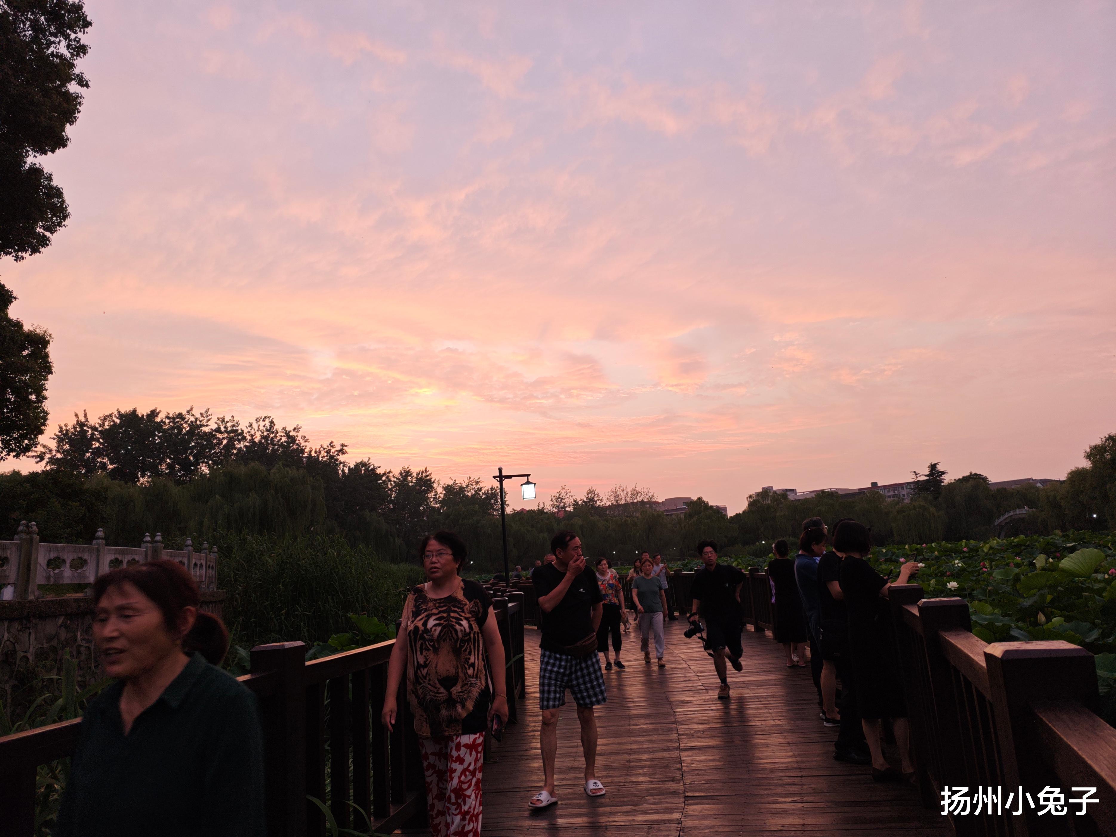 今天,和大家分享几张我最喜欢的随手拍下的照片。这张夕阳照片,拍摄于一个普通的傍晚。从汶河路回家,经过荷花池公园。无意间转头看向公园那边,突然被眼前的景色吸引住了:夕阳的光辉,洒在远处扬大的建筑上,给那座造型独特的建筑物披上了一层金色的纱衣。满池荷叶在夕阳照耀下,微风中的荷叶,翻卷着金色、绿色的浪。