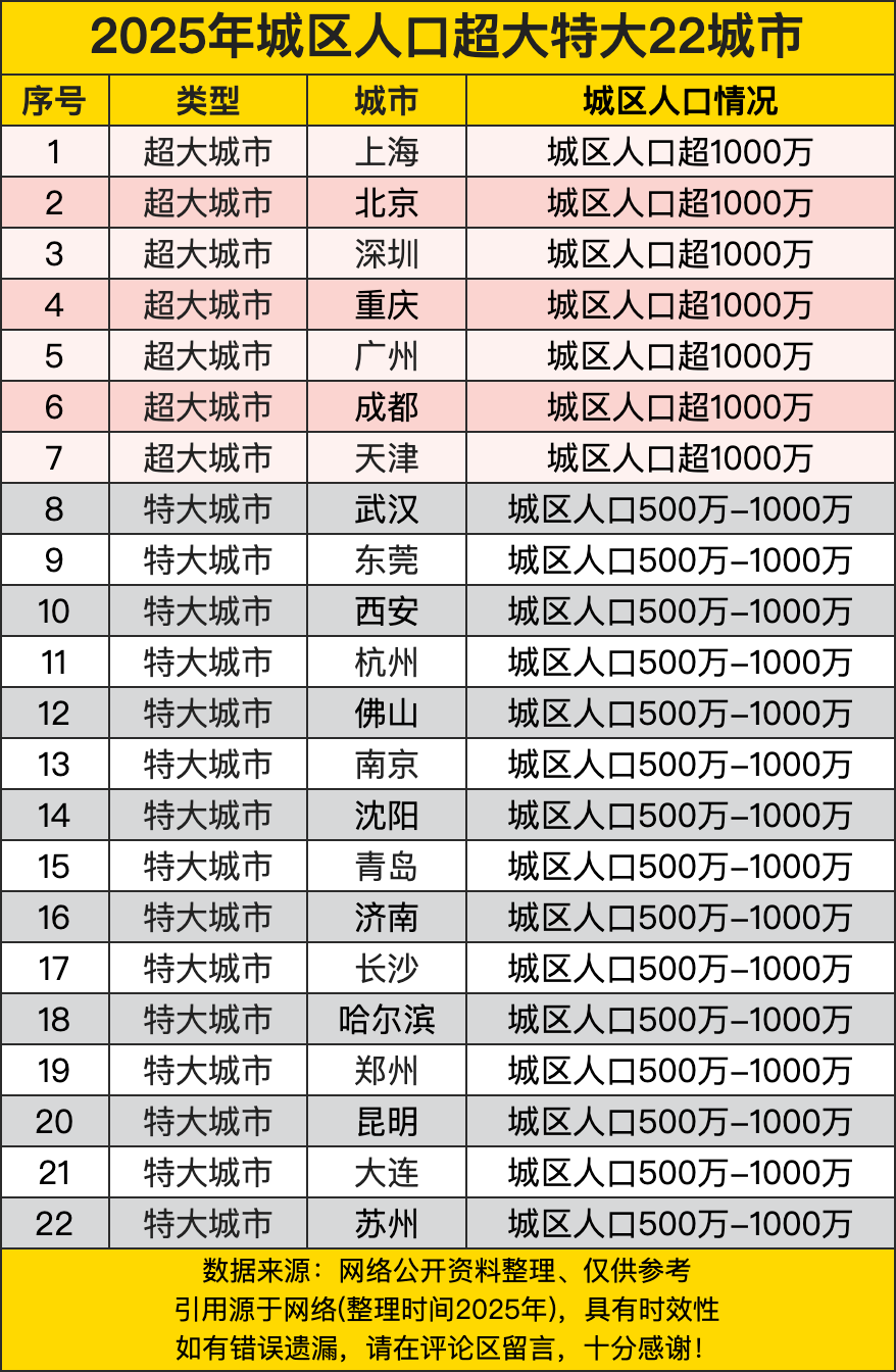 国内城区人口“超大+特大”的22座城市名单!先看超大城市这波“重量级选手”——上海、北京、深圳、重庆、广州、成都、天津,整整7个城市城区人口都突破千万大关了!想象下,一个城区塞下千万人是什么概念?早晚高峰的地铁、商圈里的人潮,光脑补都觉得热闹得不行~这些城市不光人多,经济活力、资源配套、发展机会也跟着人口一起“膨胀”,妥妥的全国乃至全球竞争力担当!再看特大城市阵营,一口气列出15个!武汉、东莞、西安、杭州、佛山、南京、沈阳这些城市都在列,它们城区人口卡在500万到1000万之间。别觉得“特大城市”比“超大城市”差一档就不香了,能进这个梯队,说明产业实力、城市基建、人才吸引力都硬气着呢!比如东莞靠制造业“吸粉”无数,西安是西北文化+科技枢纽,杭州互联网氛围拉满…每个特大城市都有自己的“必杀技”,人口跟着机会跑,这些城市就是最好的风向标!这22座城市能在“城区人口”赛道上突出重围,背后藏着各自的发展密码。超大城市拼的是综合实力“天花板”,特大城市则是区域辐射力和特色产业的“主战场”。咱普通人看这份名单,既能看懂城市发展的梯队格局,也能琢磨自己生活的城市有没有上榜,或者未来想往哪个“量级”的城市闯闯~你家所在的城市在不在这22个里?觉得这些城市的人口规模和发展势头搭不搭?评论区聊聊你的看法呀~
