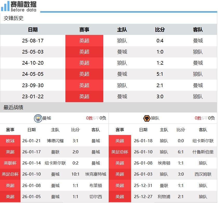 第一:两队情况!英超22轮战罢,曼城13胜4平5负积43分排名第二,落后榜首阿森纳多达7分,争冠基本上已经掉队;狼队1胜5平16负积8分排名垫底。上轮英超,曼城客场0-2完败给曼联,若不是门柱帮忙和多纳鲁马多次神扑,曼城就是惨案,周中欧冠曼城爆冷,客场1-3送博德闪耀本赛季欧冠首胜,瓜迪奥拉如今已经成为冷门制造商,全队状态低迷;狼队主场0-0战平纽卡斯尔,各项赛事近5场2胜3平保持不败,其中英超近4轮1胜3平保持不败,状态回勇。